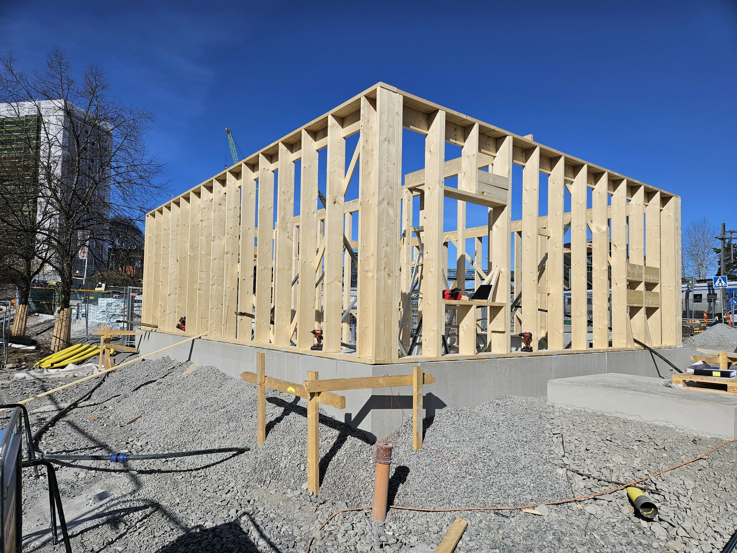 Markförutsättningarna har varit utmanande och omfattande pålningsarbeten har genomförts för att skapa en stabil grund. Nu är stommen rest och projektet har tagit ett tydligt kliv framåt.